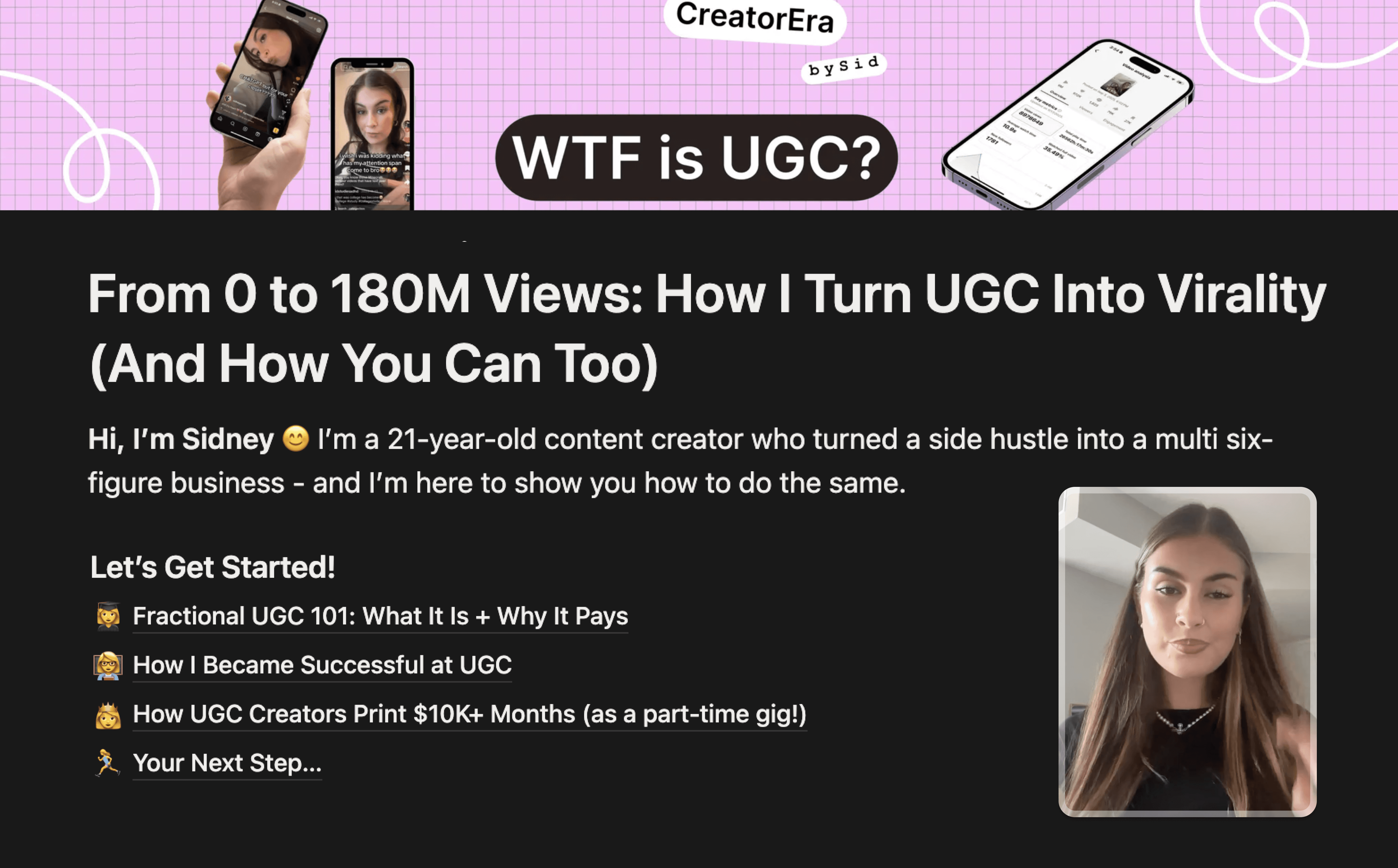 Sidney has been an incredible content coach, always sharing new ideas that increase my chances of going viral. Thanks to UGC and her support, I’ve been able to build an income and a life I never would have anticipated.